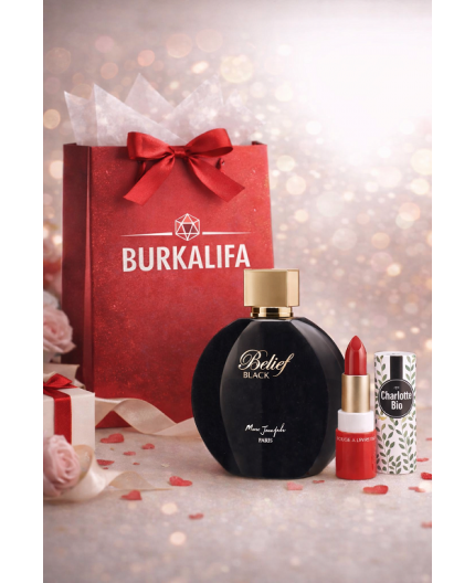 BELIEF BLACK 100ml Eau De Parfum + DOVANA CHARLOTTE BIO MATINIAI LŪPŲ DAŽAI raudonos spalvos + nemokamas firminis BURKALIFA DOVANŲ MAIŠELIS.