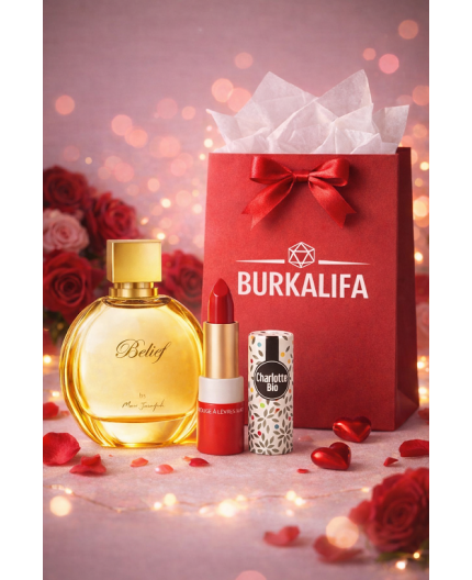 BELIEF 100ml Eau De Parfum + DOVANA CHARLOTTE BIO MATINIAI LŪPŲ DAŽAI raudonos spalvos + nemokamas firminis BURKALIFA DOVANŲ MAIŠELIS.